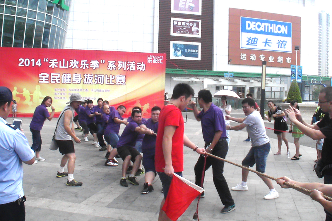 2014年8月31日,乐都汇广场上矗立着一块巨大的背景墙,背景墙上印着“2014‘禾山欢乐季’系列活动全民健身拔河比赛”几个醒目大字,红色的背景给人激情与阳刚,金色的拔河影像让人马上进入拔河世界。