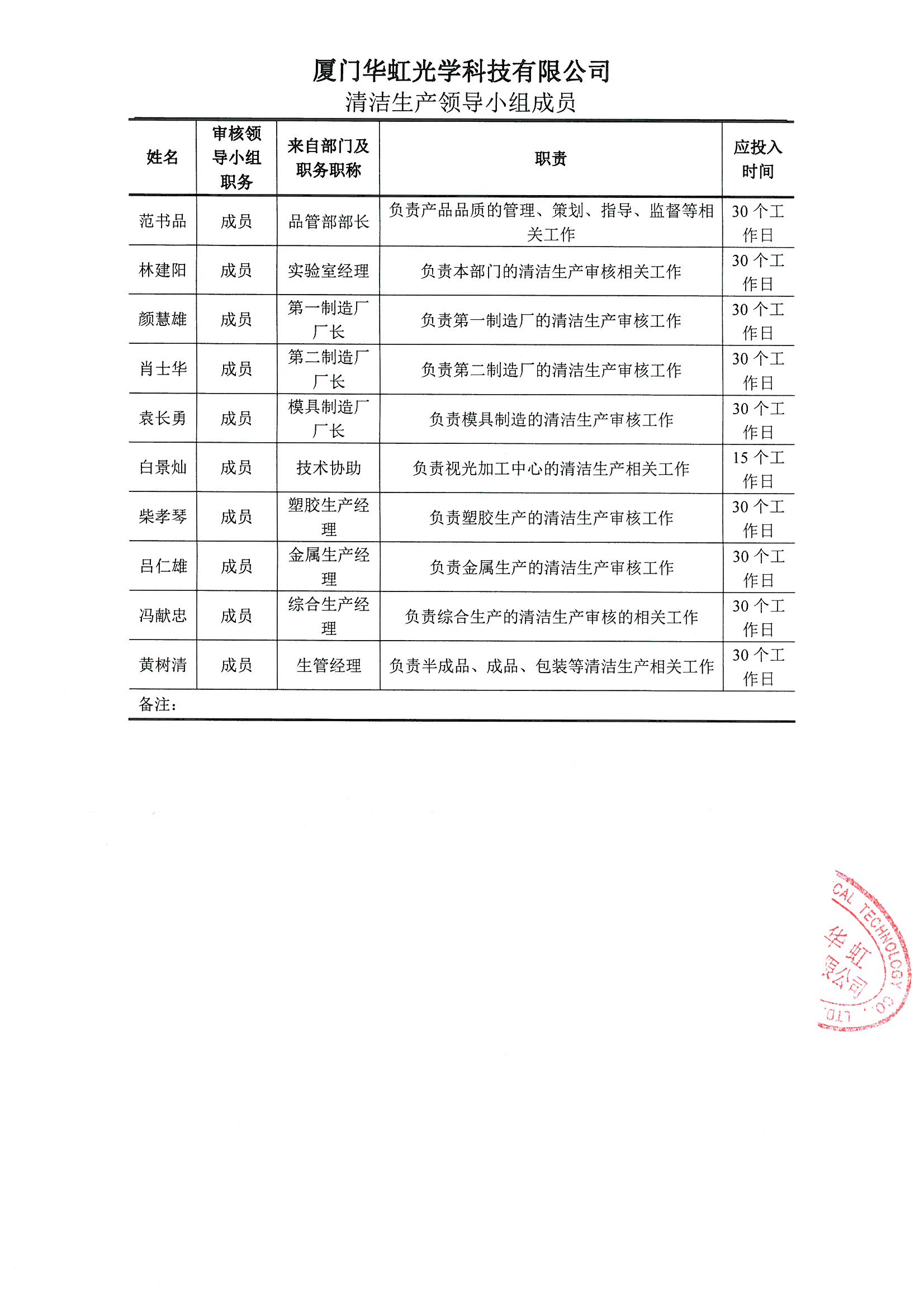 厦门华虹光学科技有限公司关于成立清洁生产审核领导小组的通知