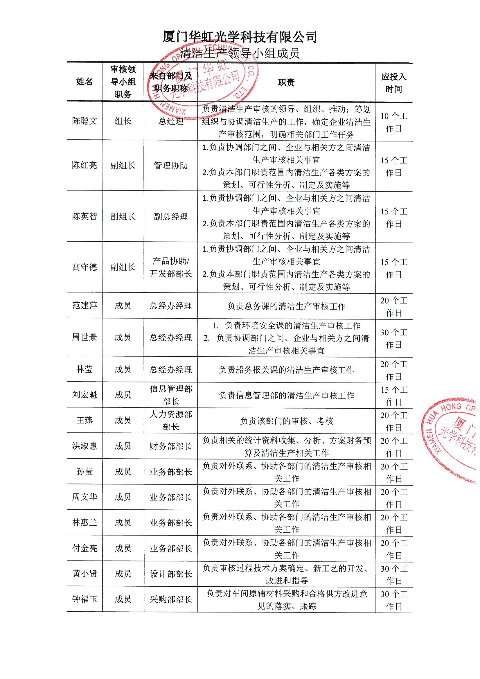 厦门华虹光学科技有限公司关于成立清洁生产审核领导小组的通知